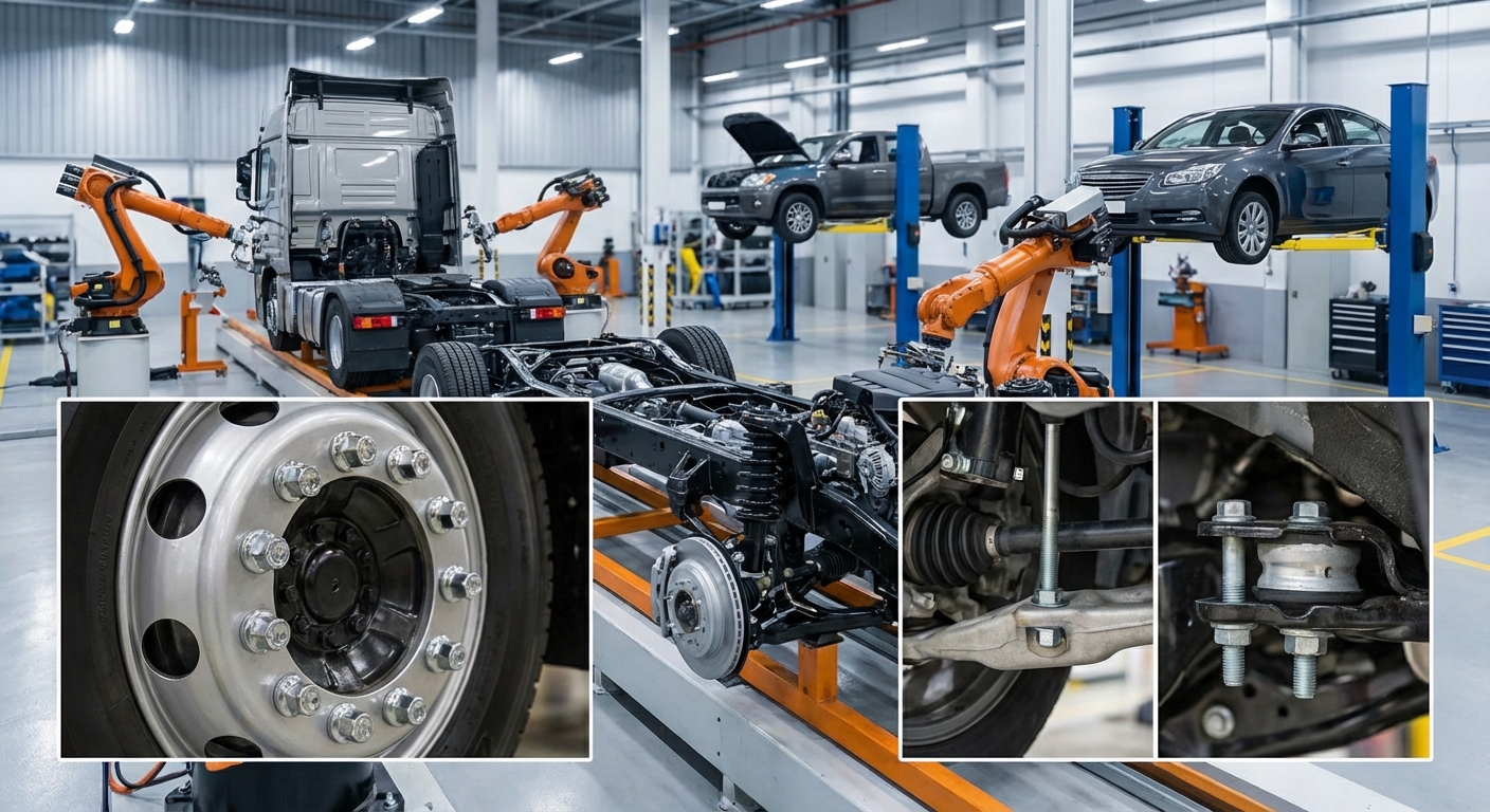elementy złączne dla pojazdów ciężarowych i osobowych, m.in. śruby kół, zawieszeń, mocowań silnika.