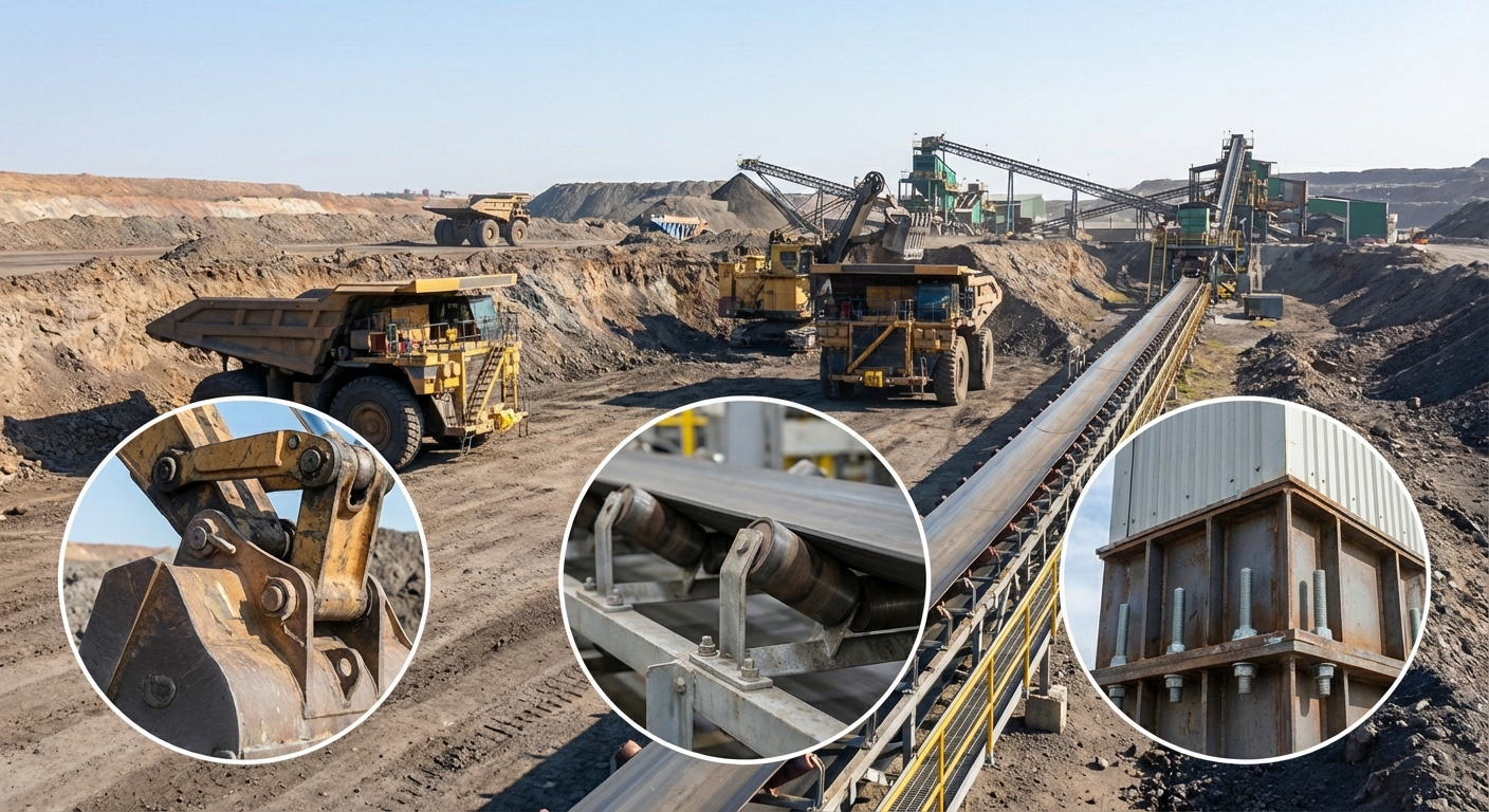śruby i sworznie do urządzeń górniczych, przenośników, obudów szybów.