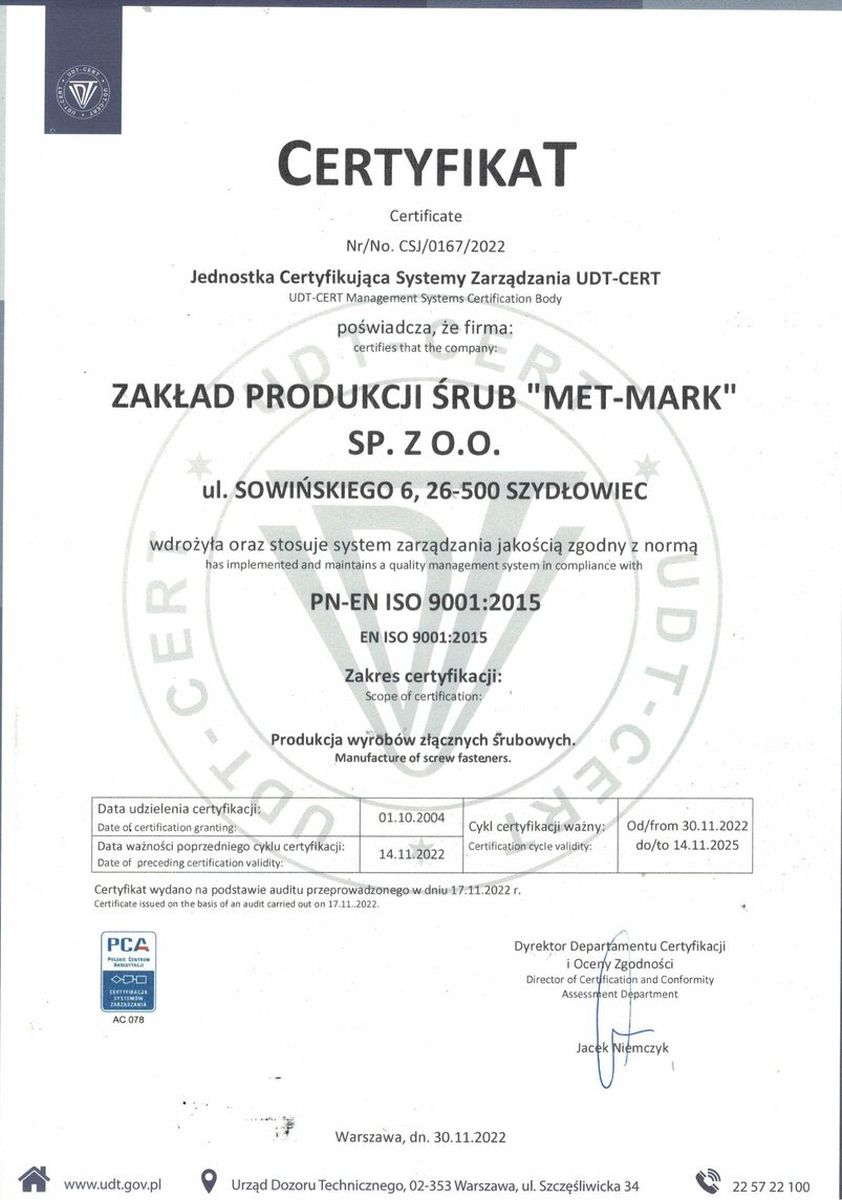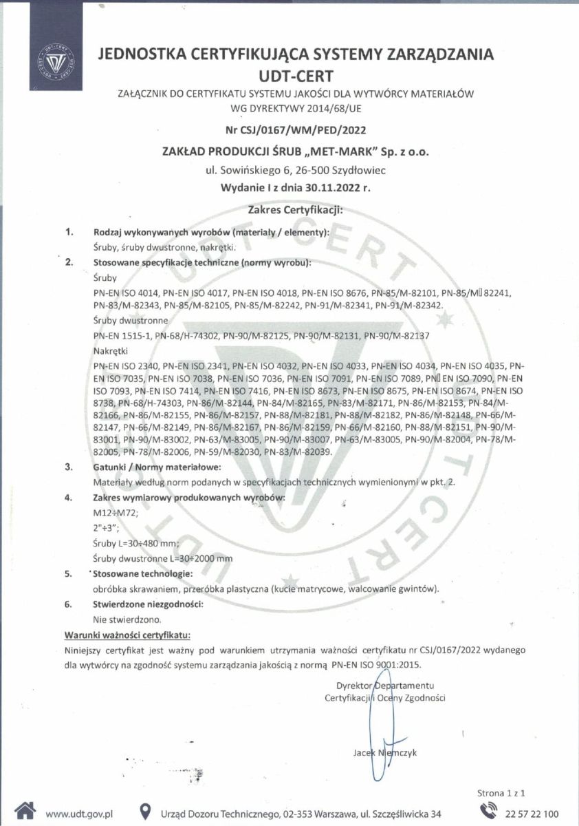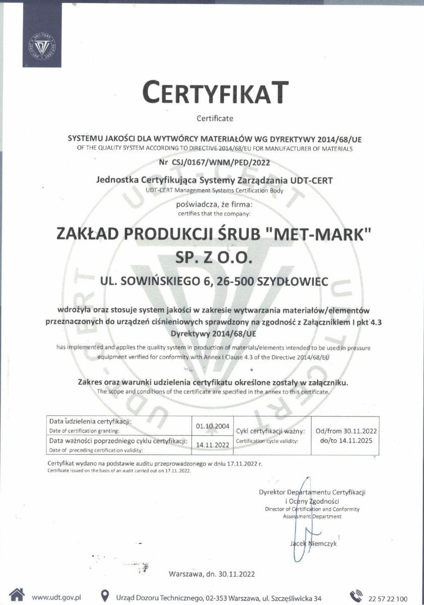 Firma posiada wdrożony system zarządzania jakością zgodny z PN-EN ISO 9001:2015 oraz certyfikat UDT dla wytwórcy materiałów zgodnie z Dyrektywą 2014/68/UE (PED), co potwierdza spełnianie rygorystycznych wymagań dla zastosowań przemysłowych i ciśnieniowych.