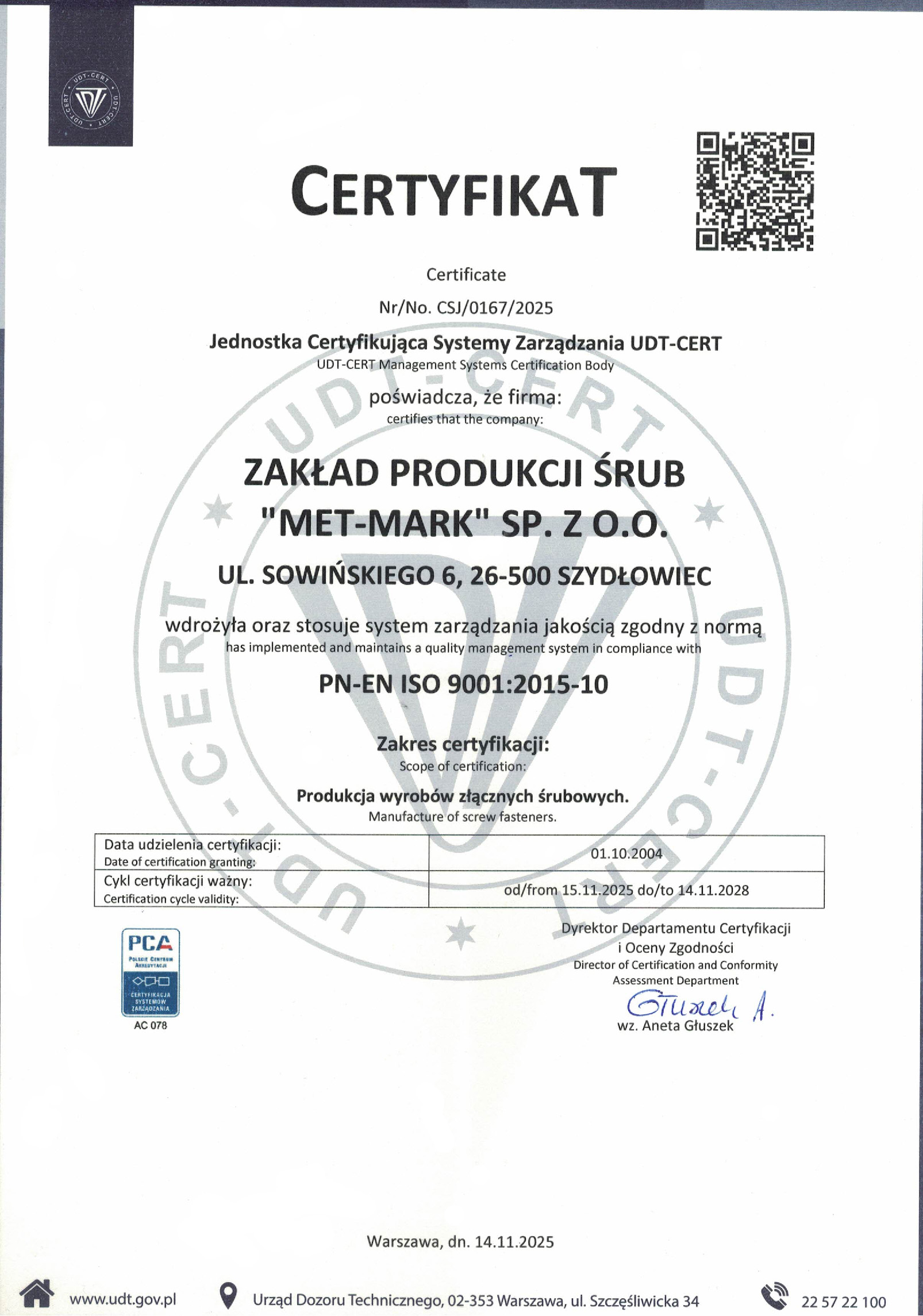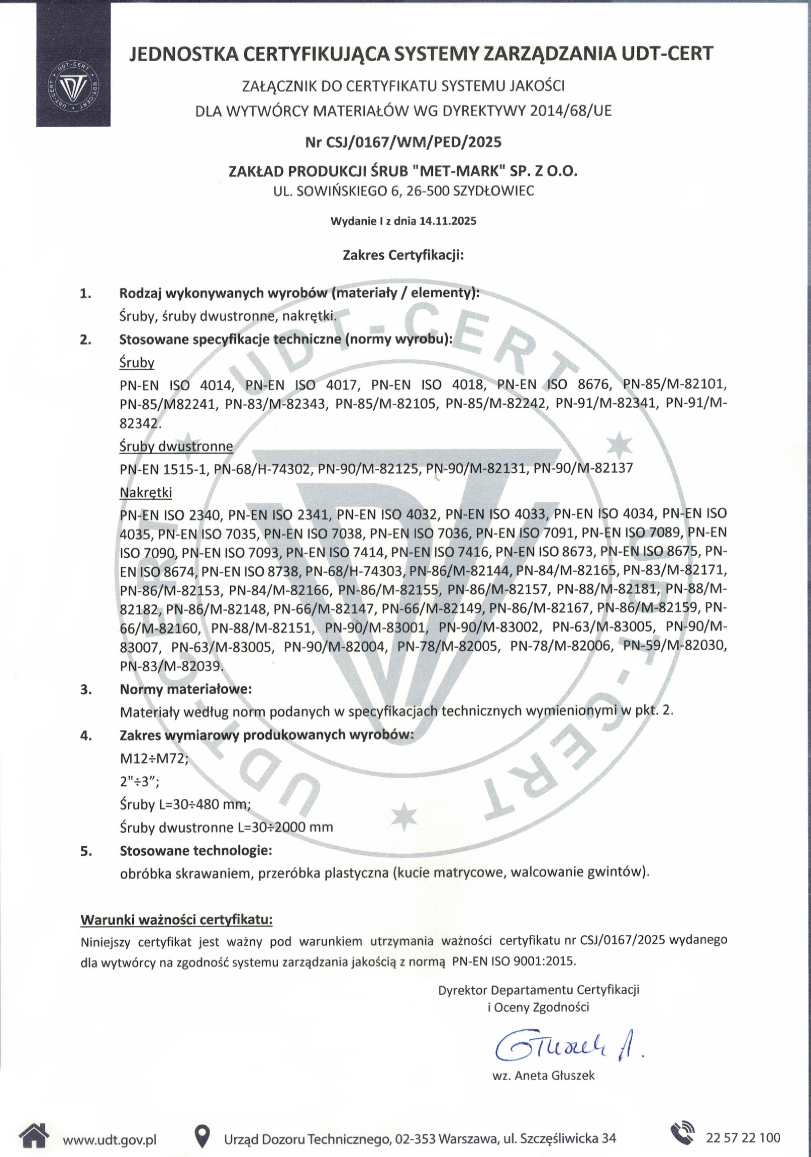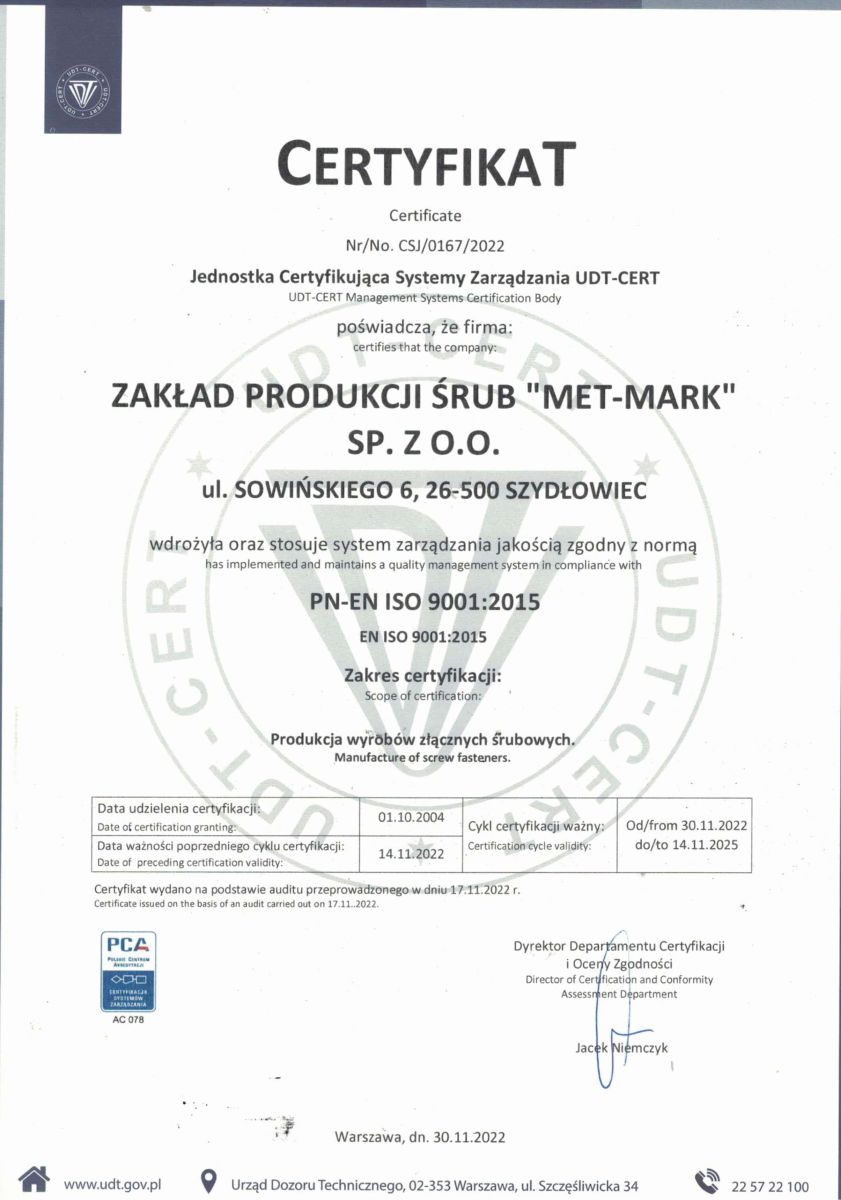Firma posiada wdrożony system zarządzania jakością zgodny z PN-EN ISO 9001:2015 oraz certyfikat UDT dla wytwórcy materiałów zgodnie z Dyrektywą 2014/68/UE (PED), co potwierdza spełnianie rygorystycznych wymagań dla zastosowań przemysłowych i ciśnieniowych.
